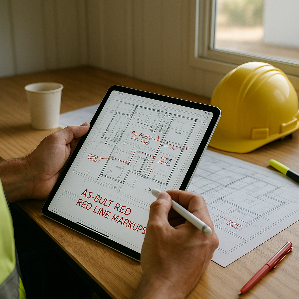 Accurate Markup of Drawings – updating construction plans with clear red-line annotations that highlight any changes or deviations from the original design.
